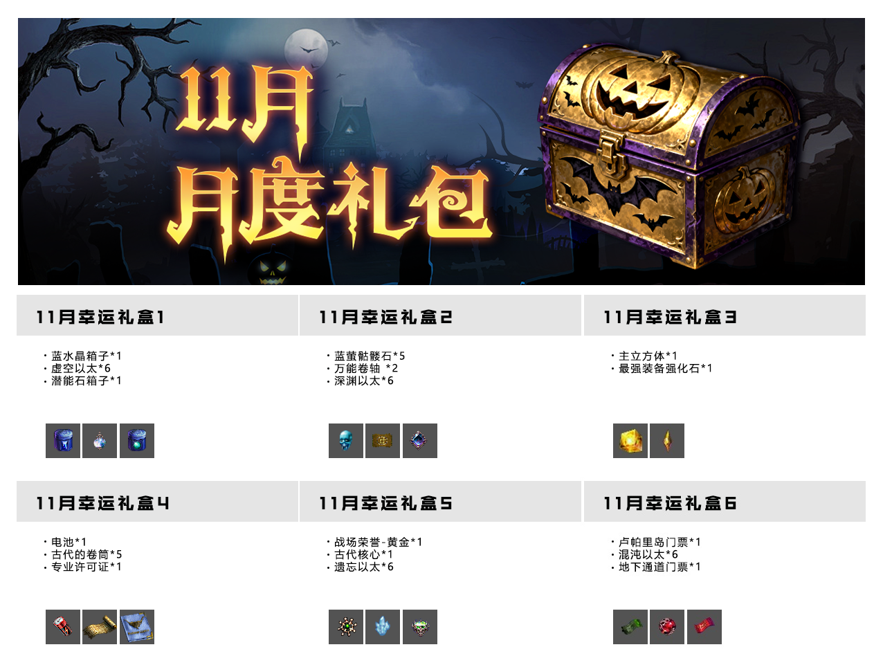 ·月度礼包购买后无法取消。 ·月度礼包在游戏商城内购买,购买后的礼包将发放到角色购物车内。 ·如果您的游戏内购物车中有超过 50 件物品,则可能无法正常领取。 ·11月礼包概率:幸运礼盒1:36% 幸运礼盒2:20% 幸运礼盒3:1.1% 幸运礼盒4:1.5% 幸运礼盒5:11.4% 幸运礼盒6:30% ·每个幸运礼盒中都必会开出一个夏日碎片,夏日碎片可以在佩罗那 向导NPC 处兑换道具。