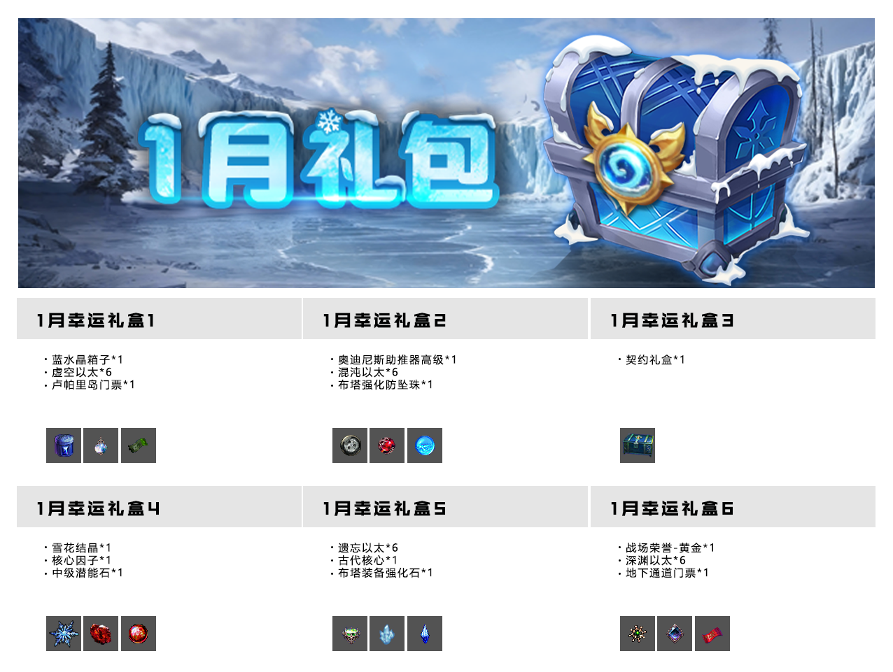 ·月度礼包购买后无法取消。 ·月度礼包在游戏商城内购买,购买后的礼包将发放到角色购物车内。 ·如果您的游戏内购物车中有超过 50 件物品,则可能无法正常领取。 ·1月礼包概率:幸运礼盒1:36% 幸运礼盒2:20% 幸运礼盒3:1.1% 幸运礼盒4:1.5% 幸运礼盒5:11.4% 幸运礼盒6:30% ·每个幸运礼盒中都必会开出一个夏日碎片,夏日碎片可以在佩罗那 向导NPC 处兑换道具。